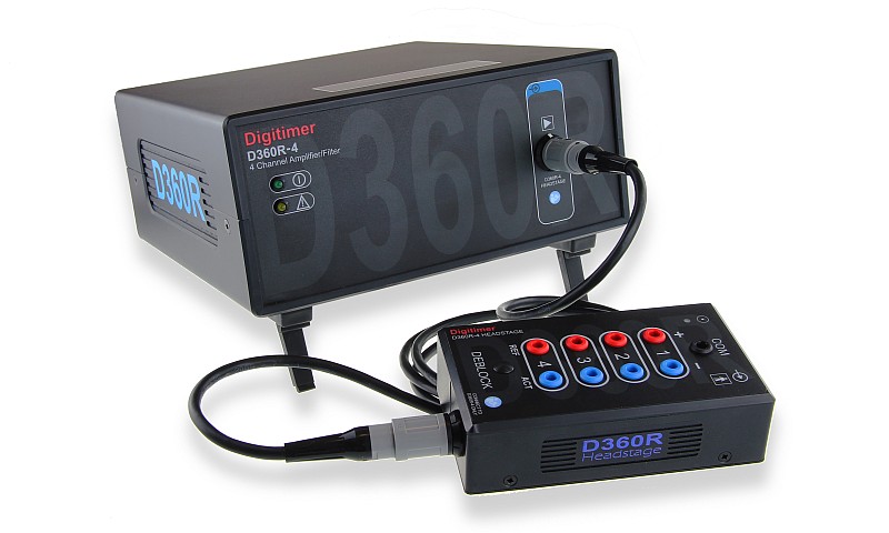 The D360R-4 comprises a main amplifier unit, a remote pre-amplifier headstage with 4 pairs of differential inputs (plus Common) and dedicated Windows-compatible Client Software. The software provides a virtual front panel for the adjustment of settings, including low-pass and high-pass filters as well as amplifier gain. The pre-amplifier headstage is attached to the main amplifier via a fully detachable 2m long cable, which is easily replaced if it becomes damaged during use.