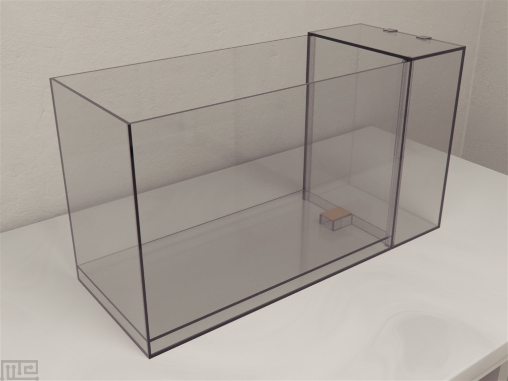 The puzzle box is made from Plexiglas sheets. The larger chamber is brightly illuminated with a lamp, while the other smaller chamber is kept dark by the lid to cover the top and the black Plexiglas separating the two chambers. A timer could be used to record the time it takes the subject to move from the bright chamber to the dark goal box