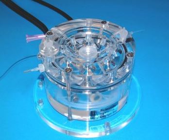 The chamber is constructed from clear acrylic having a diameter of 100 mm, height is 85 mm and the base plate is 130 mm in diameter. The slices rest on a nylon net fixed on to a removable insert, located in the centre of the chamber. Pre-oxygenated medium enters the main body of the chamber through a fine bore tube which spirals in the heated distilled water in the lower part of the chamber and enters the upper part of the chamber via a bubble trap. Depending on whether submerged or interface type preparations are required, the height of the perfusion fluid is adjusted at the exit well by means of a needle on a screw mechanism. In the case of interface preparations, the high oxygen tension is maintained by bubbling a 95% oxygen, 5% carbon dioxide gas mixture through a ceramic bubbler located in the lower heated part of the chamber. This moistened and warmed gas mixture enters the upper part of the chamber via "port holes" and is then deflected by a profiled lid across and downwards towards the centrally located slice preparation. The temperature in the upper chamber is maintained by ensuring that the medium and moistened gas mixture enter at the required temperature. This is dependent on the temperature of the lower chamber body which is warmed by a heating element controlled by the Proportional Temperature Controller, PTC03