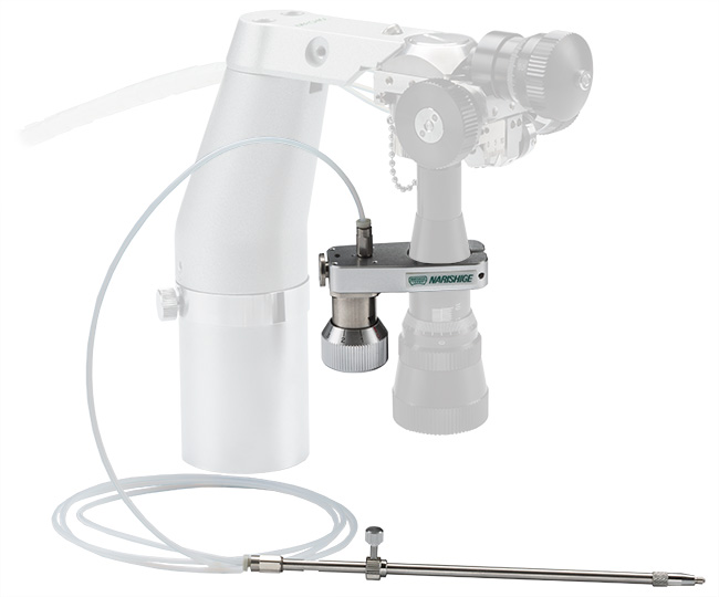 This pneumatic injector is intended exclusively for holding an egg. It can be attached to the manipulator joystick, which allows holding and releasing an egg in a delicate and secure manner operated only with a forefinger. It enables doing micromanipulation and suctioning work at the same time. Two types of tubing which has different inner diameter are included to customize the response speed