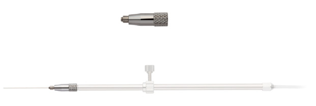 An end cap with a stainless steel collar for a 1mm outer diameter pipette. This stainless steel collar prevents loss of components and breakage of a capillary from movement of internal components