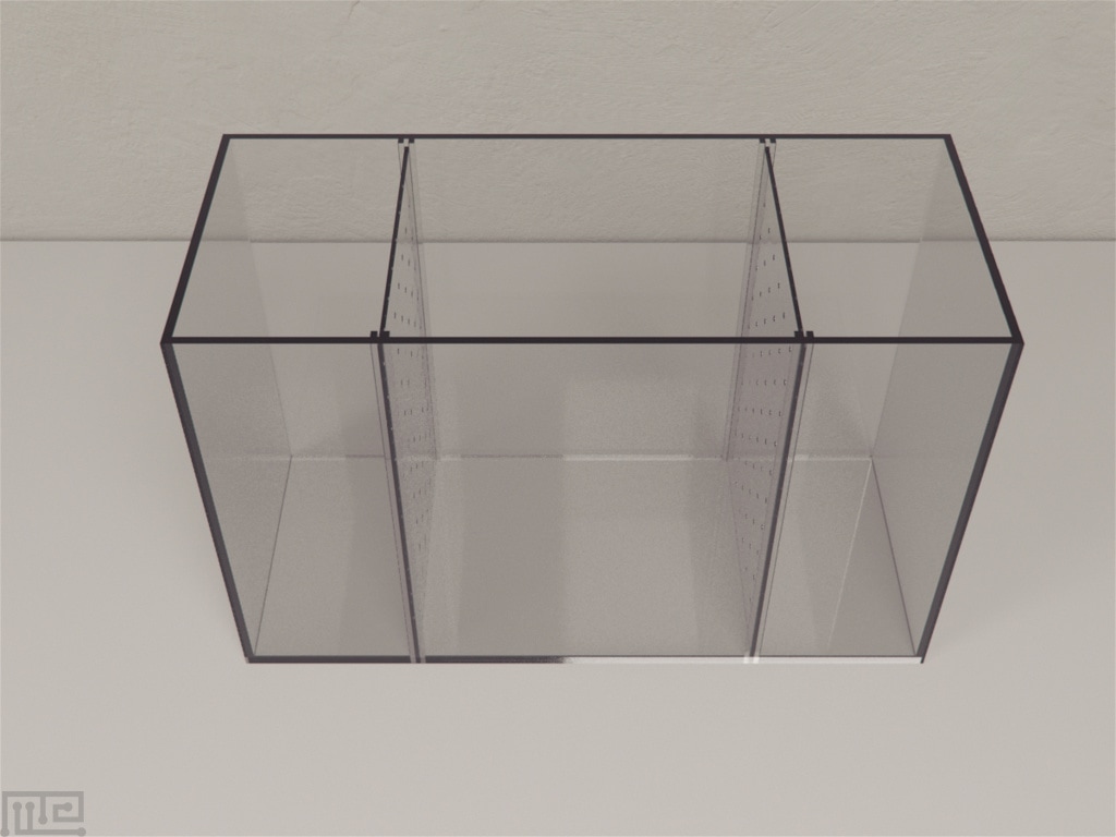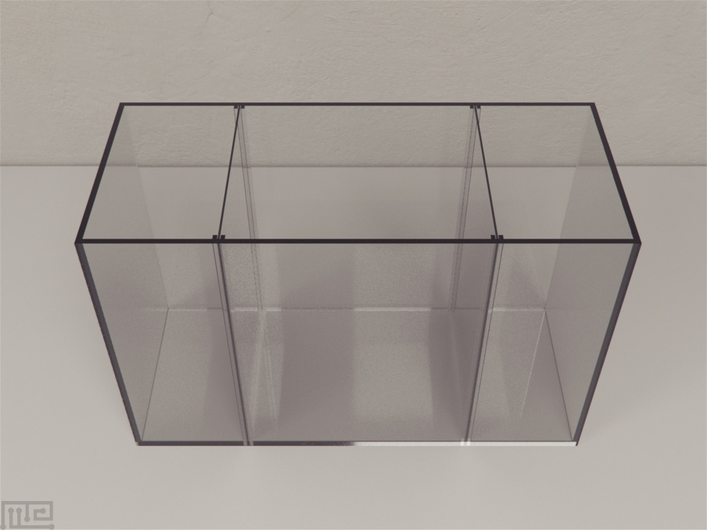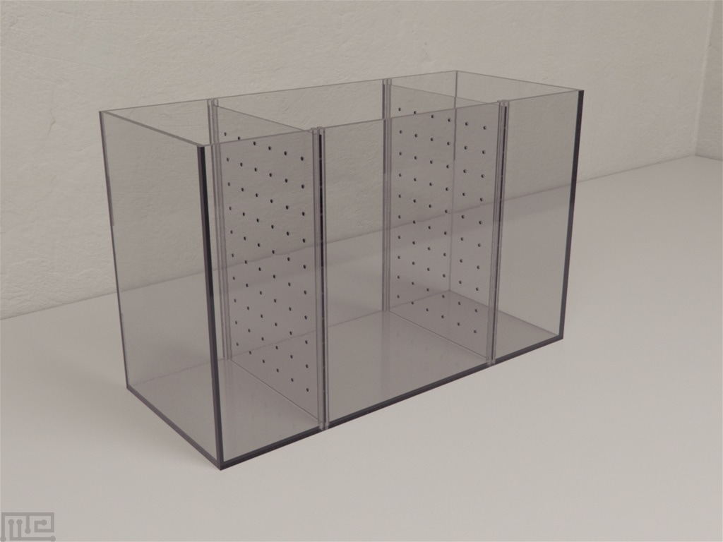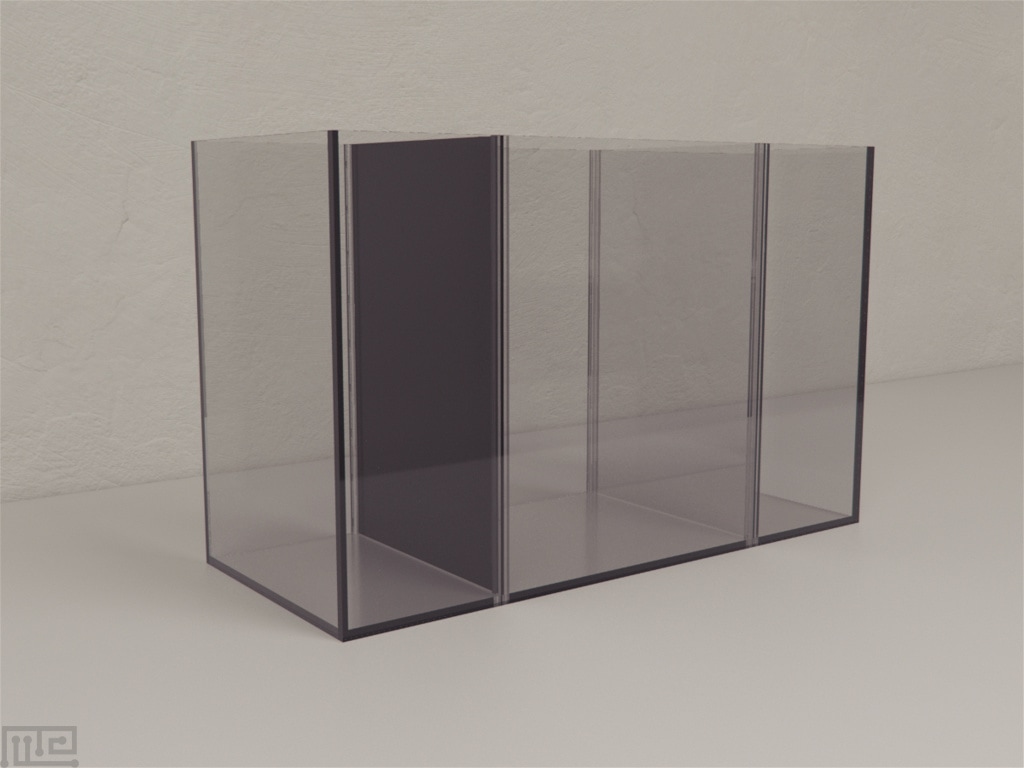 The Mirror Biting tank has dimensions 48 x 20 x 30 cm. The tank is divided into three sectors using perforated, transparent Plexiglas partitions. The two lateral compartments measure 12 x 20 cm each, and the central compartment measures 24 x 20 cm. Two marks, 6 cm, from each side of the partition, virtually divide the central compartment into three areas: a central no-choice area, a choice area for the stimulus shoal and a choice area for the empty lateral sector of the tank. A one-way mirror, 30 x 20 cm, is used in place of one of the partitions during experiments involving the mirror
