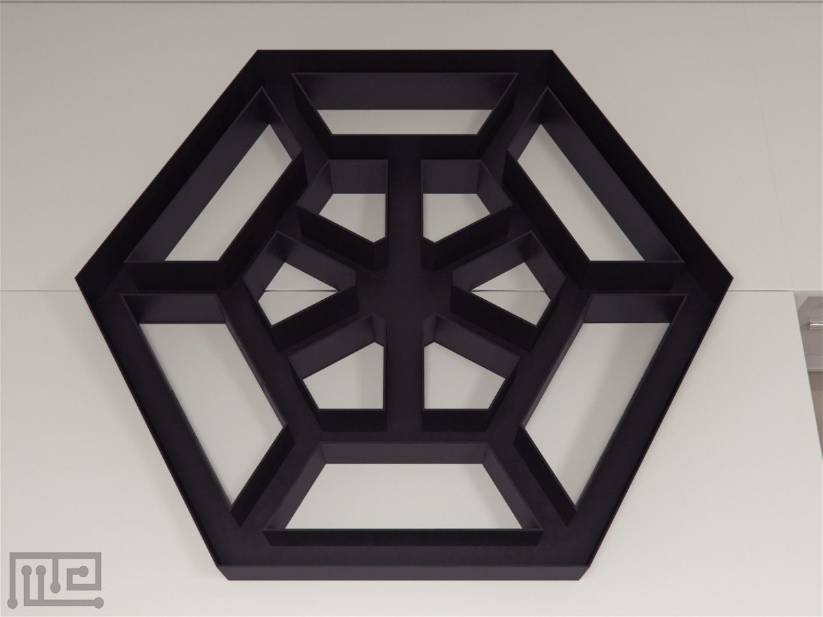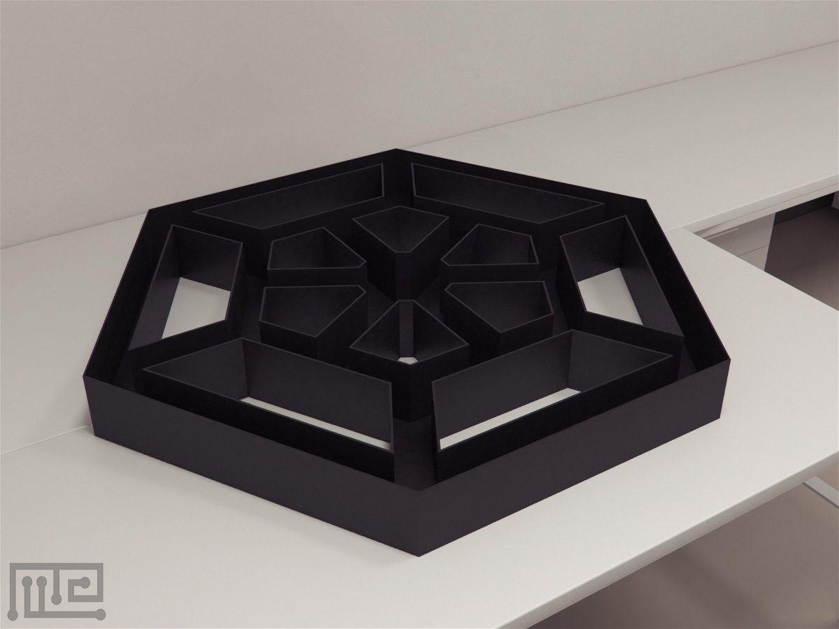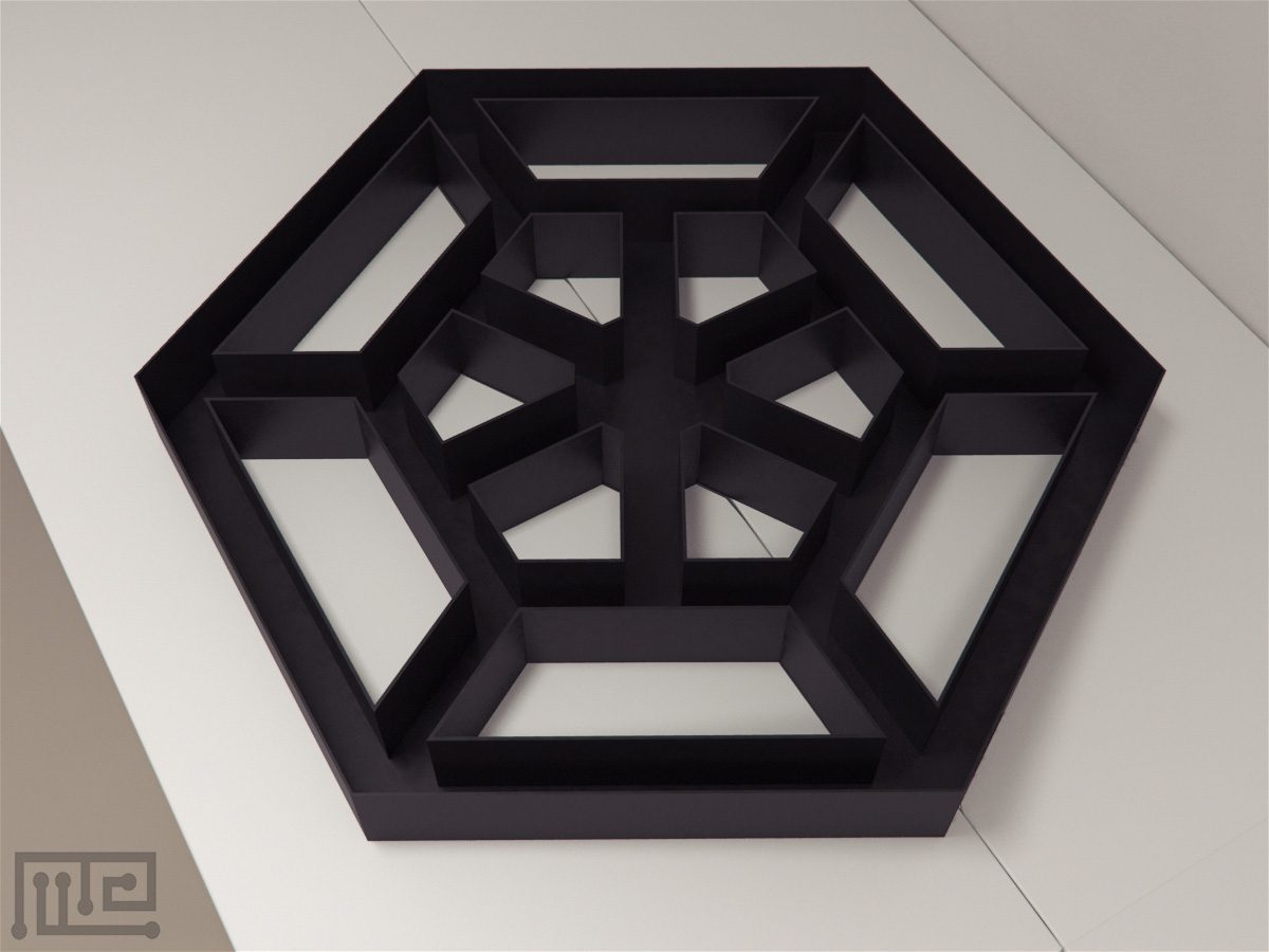 The Alley Maze is a hexagon shaped apparatus consisting of concentric, interconnected alleys created using barriers. The apparatus has a width of 8cm and a height of 15cm. The barriers create 6 alleys each generating 42 area units of varying lengths, number of corners and radial and hexagonal alleys. The maze can be equipped with photocells to record locomotion of the subject