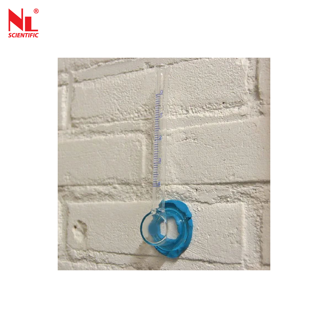 Simple test to measure the degree of water penetration in building materials such as concrete, stone and plaster. A glass tube filled with water is bound to the sample by plasticine. Water pressure is then exerted on the surface. A graduated scale indicates the amount of water that enters the surface over time
