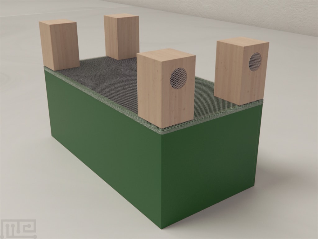 The Bumblebee spatial reorientation apparatus is a rectangular enclosureof green acrylic with an overlying insect net. 4 wooden L shaped blocks are placed in each corner and allows for access from the inside of the enclosure.