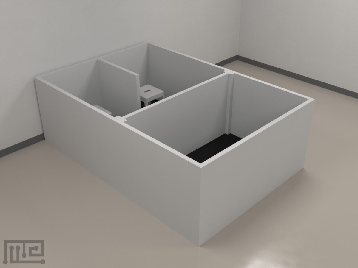 The piglet removable Y-maze has an overall dimension of 2.79 m x 1.86 m x 0.96 m. It consists of a rectangular open area that has a removable low wall divider (0.84 m) inserted on one side, forming two 0.84 m x 0.9 m choice compartments. The maze also comes equipped with a removable isolation board that can be inserted to separate the start area from the choice area, essentially creating an isolation area for the subjects