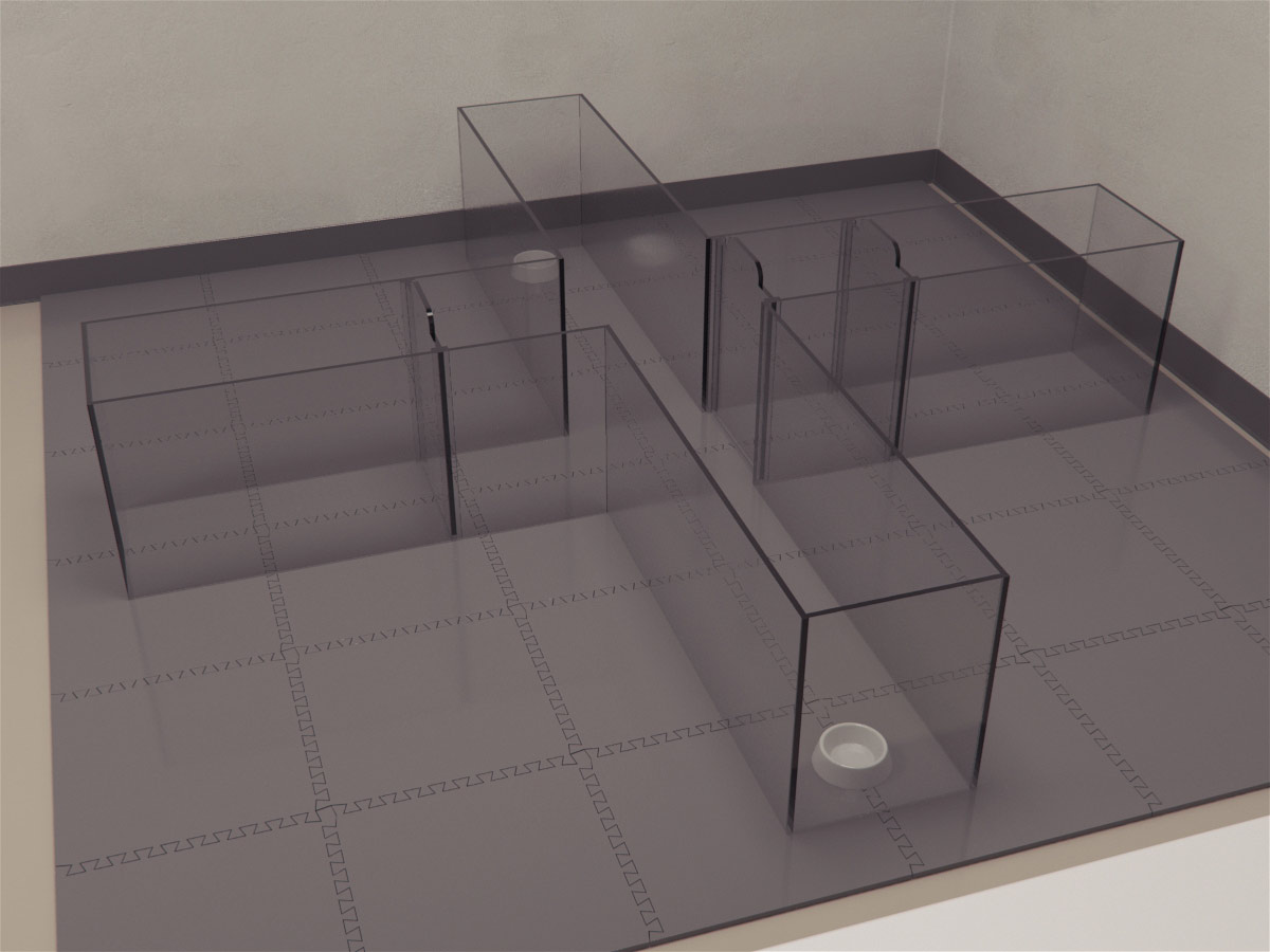 The Pig T-maze is a double T-maze, that is, it a clear plastic plus-shaped maze which is positioned over textured black rubber mats. It is possible to create a standard T-maze by blocking off one of the arms, using a removable barrier. This feature makes it possible to use two of the arms of the maze as start arms (north and south) whereas the other two arms (east and west) act as reward arms. This ability to alternate the arms allows the subject to solve the task using allocentric mechanisms instead of egocentric ones. The arms are 91cm x 30 cm with a wall height of 50 cm