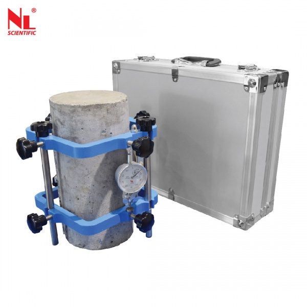 It is used to determine the strain and deformation characteristics of concrete and cylindrical specimens. It is comprises two lightweight metal castings for clamping to the specimens, two length gauge bars, a dial gauge 5 mm travel x 0.001 mm divisions. Compressometer for cylinder dia. 150 x 300, 160 x 320 mm. and 6” x 12”