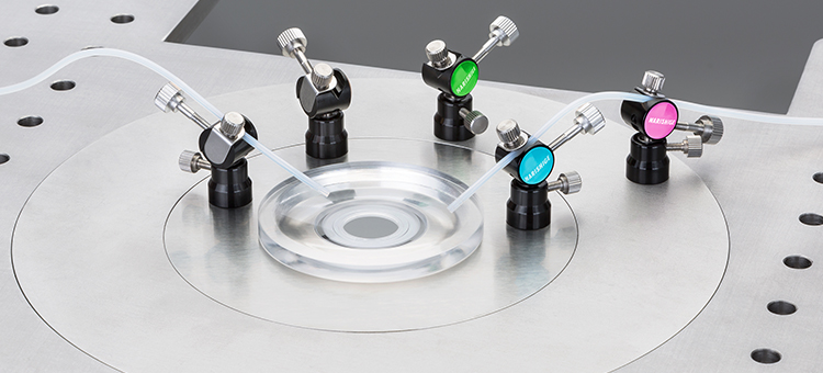 The NAC-1O is a combined set of Chamber Dish (CK-1), Adaptor Plate for CK-1 (CK-1A), and Tube Clamper (CAT-1). The magnetic CAT-1 (set of 5) can be directly attached to the CK-1A, thereby helping to keep the perfusion tubing uncluttered and tangle-free
