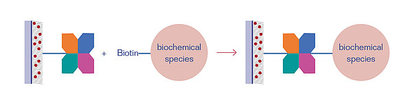 Streptavidin and Neutravidin are tetrameric proteins that can bind four Biotin molecules (vitamin B7) or any other Biotin-conjugated species with a very high specificity. The Streptavidin/Neutravidin-Biotin bond is one of the strongest, non-covalent bonds known in biochemistry, having a dissociation constant of KD = 10-15 mol/L. Thus, it is often applied in bioanalytical applications
