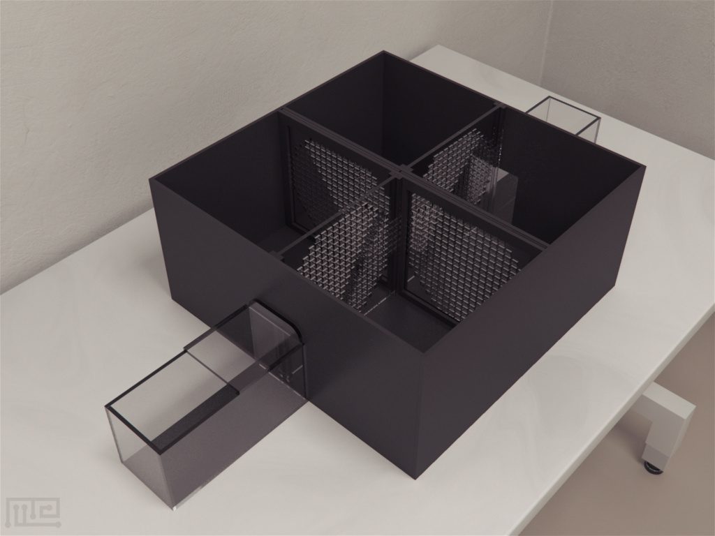 The maze design is simple, and the compartments are wide enough to house two rodents simultaneously. The perforated partition allows a complete view of the stooge and the target rat to help make the cooperation or defection decision