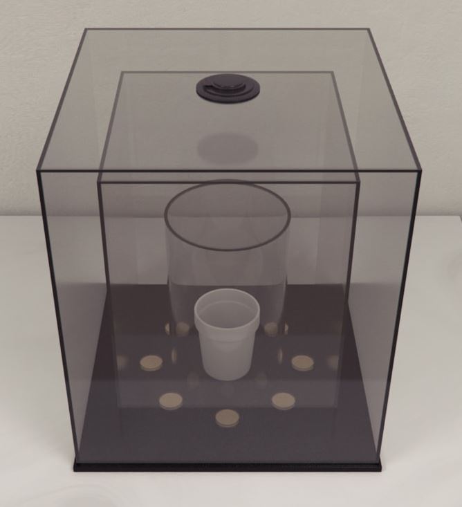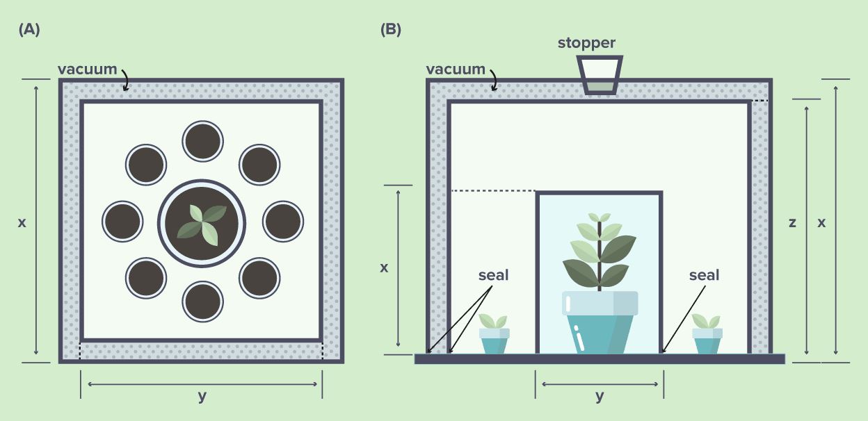Two different sized square boxes are placed inside the other, with the air in between the two boxes removed using a pump to create a vacuum and thus avoid interference between adjacent experimental units at any time