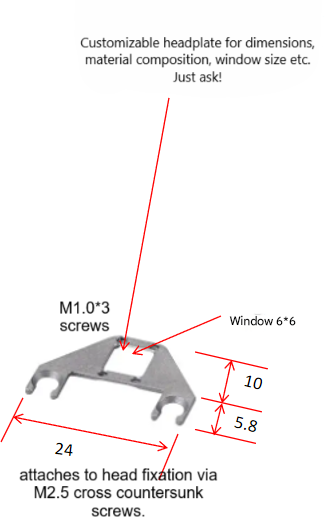 Head plate default (customizable upon request): Skull plate window 6 mm W x 6 mm L, |