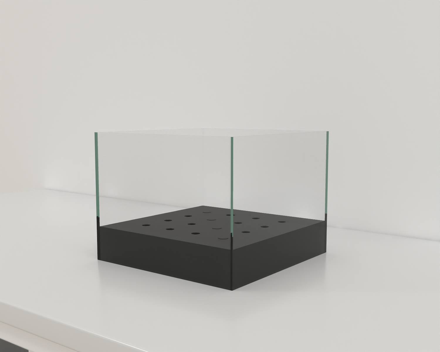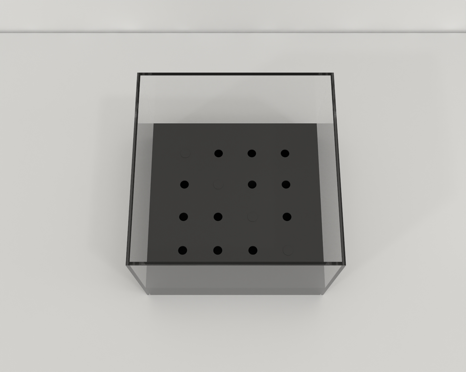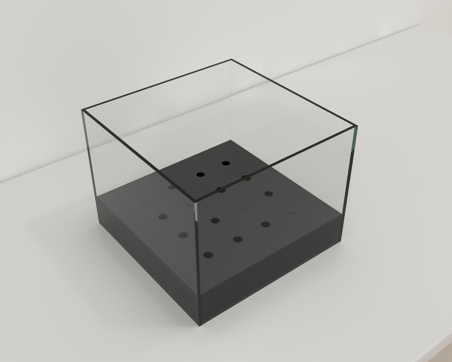 It consists of three testing transparent acrylic boxes of dimension and a removable grid-patterned hole board. The holes of the grid come equipped with lids to allow the closing of holes to create variations in the grid configuration