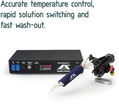 You can have rapid switching, fast wash-out, and accurate temperature control at the same time. Set the ThermoClamp temperature from ambient to 50°C. A front-panel BNC provides an analog output of current temperature for recording. Different sizes of replaceable tips are interchangeable with our standard Perfusion Pencil. The tips have microliter dead volume for rapid switching. See ThermoClamp Flow Rates on the Perfusion Pencil page. No messy water jacket is required, but the separate high-flow line is capable of heating a perfusion chamber with water jacket if desired