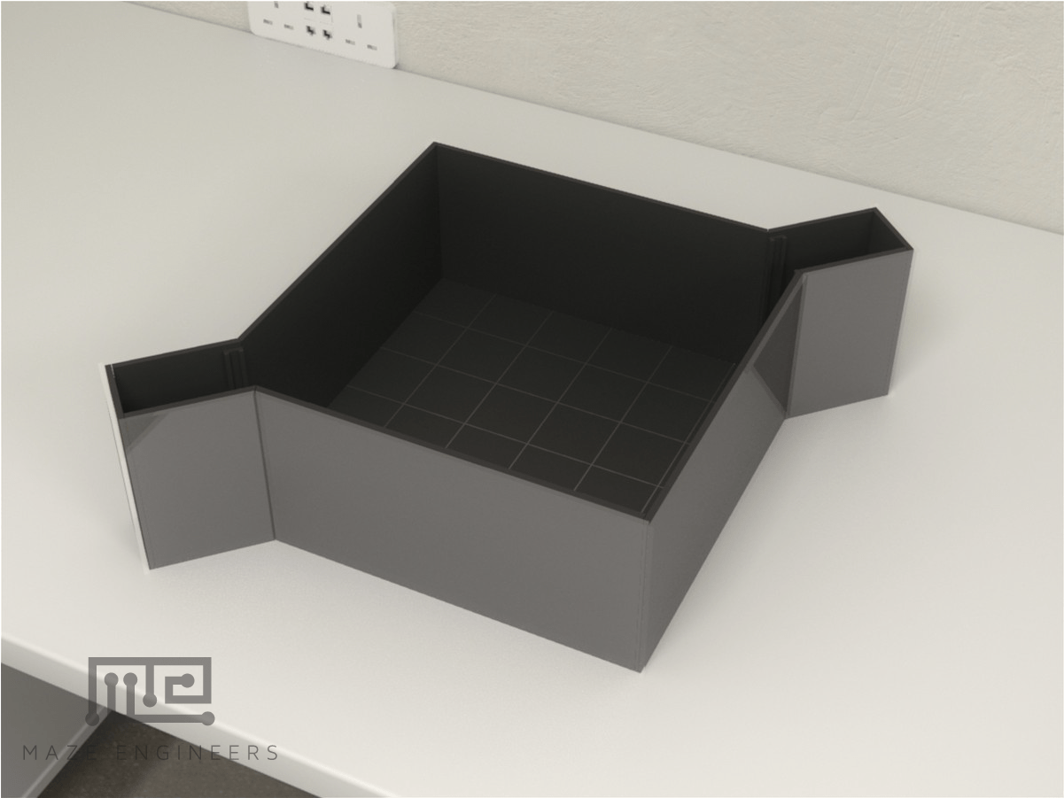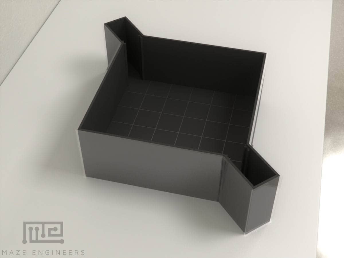 The apparatus for the Hebb-Williams Maze consists of a square area, usually 60×60 cm with 10 cm walls for mice, and 75×75 cm with 25 cm walls for rats. One corner is designated the start of the maze, and the opposing corner contains a goal box with a well to hold a food reward. The interior walls of the maze can be moved to create different paths through the maze. The walls are typically opaque black or white, and are available in matte to prevent reflections. The apparatus may be placed on a table and does not require its own stand.