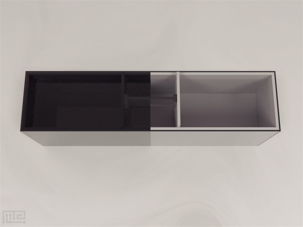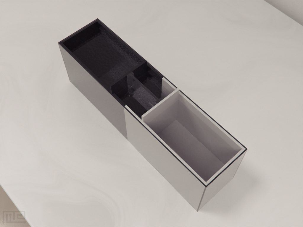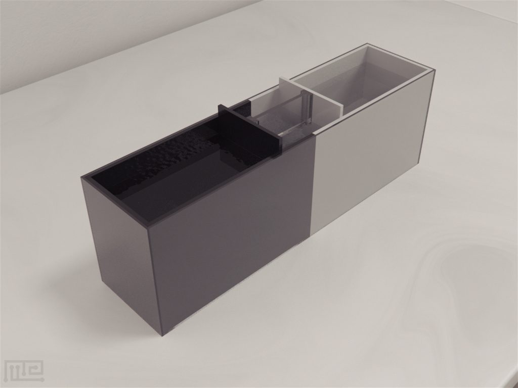 The Light Dark Tank for Zebrafish is an acrylic tank (15 cm × 10 cm × 45 cm height × width × length) that is divided equally into one-half black and one-half white. Walls and bottom are either black or white, so as to create a similar experimental paradigm to the rodent light dark box.