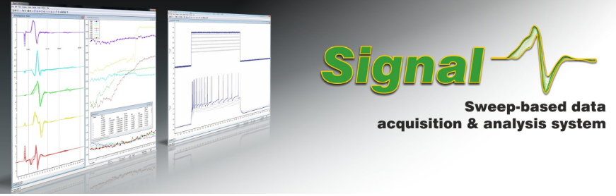 Signal is a sweep based data acquisition and analysis package. Its uses range from a simple storage oscilloscope to complex applications requiring stimulus generation, data capture, control of external equipment and custom analysis. This flexibility makes it ideal for a wide range of applications including transient capture, patch and voltage clamp, LTP studies, evoked response and Transcranial Magnetic Stimulation (TMS).
