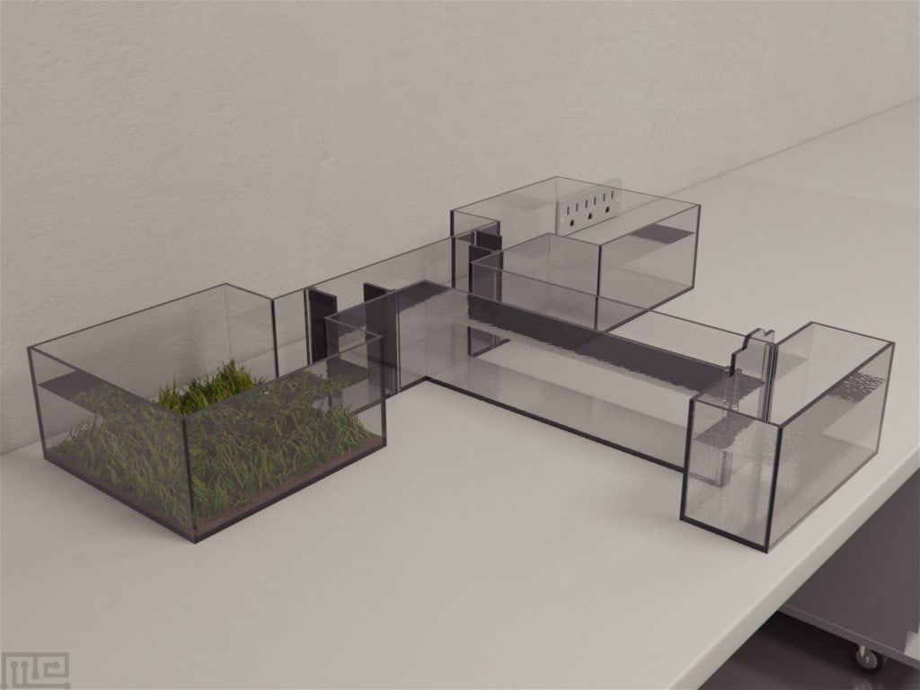 | One of two chambers, used as reservoir, contained artificial grass, shells, stones and coloured marbles that offered a favourable habitat for the fish. These supplies are not included |