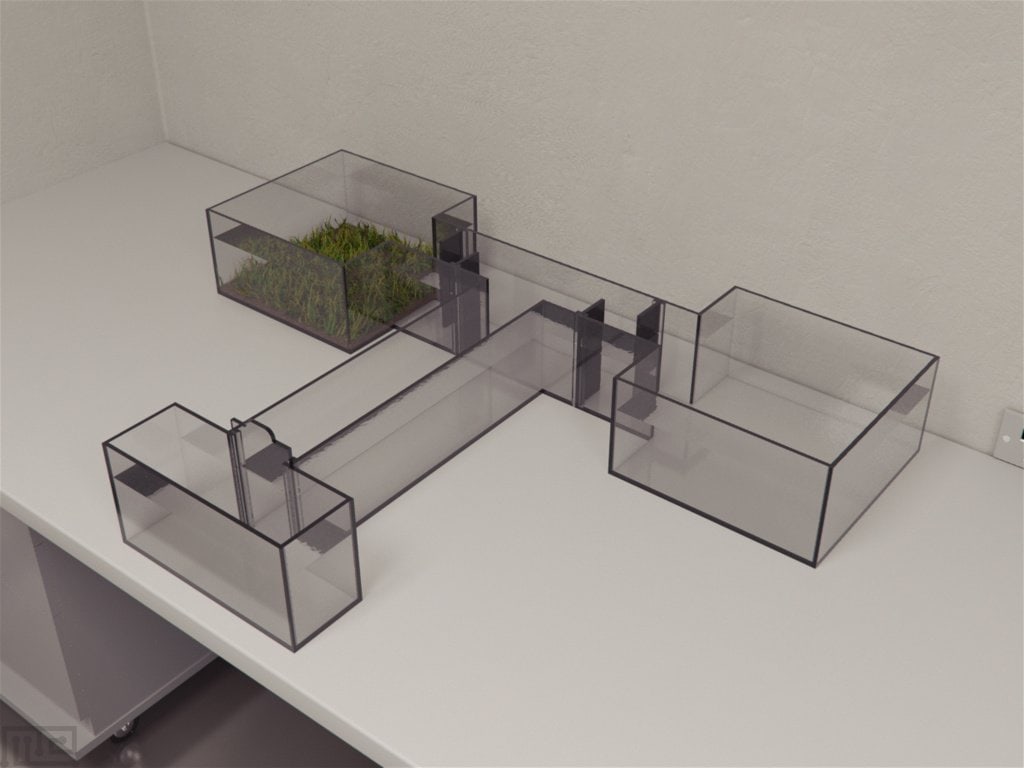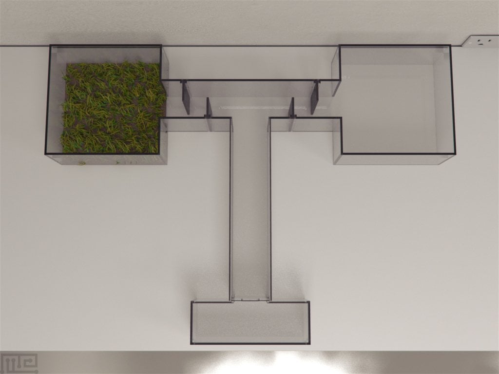 The Zebrafish Bifurcating T-maze is an acrylic aquatic tank shaped like a capital ‘T.’ The long start arm (50 x 10 cm) bifurcates into two shorter choice arms (20 x 10 cm). The start arm has a 30 x 10 cm start zone that is separated from the rest of the maze by a removable transparent door. The ends of each choice arm are equipped with removable, deep water chambers of dimension 30 x 30 cm. Either of the chambers can be turned into a reservoir by addition of artificial grass, colored marbles, etc. Additionally, a 4.5 x 30 cm removable, opaque partitions can be placed beginning of the short arms to prevent viewing of the two chambers