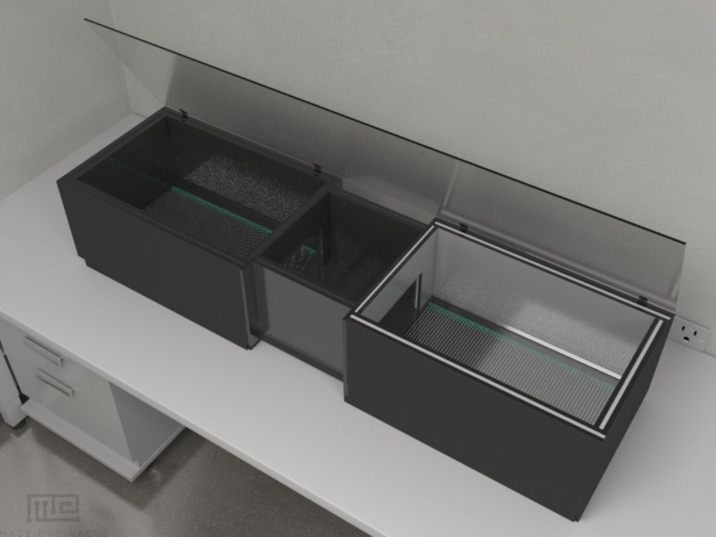 The Automated Conditioned Place Preference Apparatus consists of three acrylic compartments or chambers. Two compartments serve as the experimental compartments, which are interconnected by the third compartment, which is smaller in size. A clear removable acrylic lid covers all three compartments