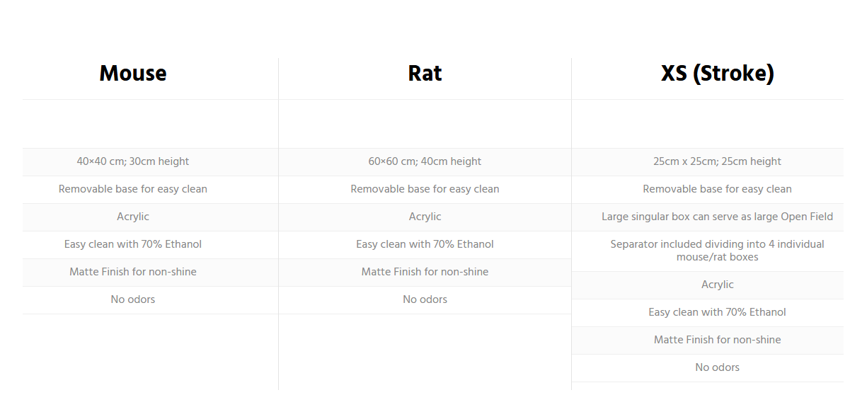 Walls can be both opaque (grey, blue, white, black) or clear. We recommend that clear walls are used for measurements of anxiety behaviors, while opaque walls are used if assessments include novel object recognition